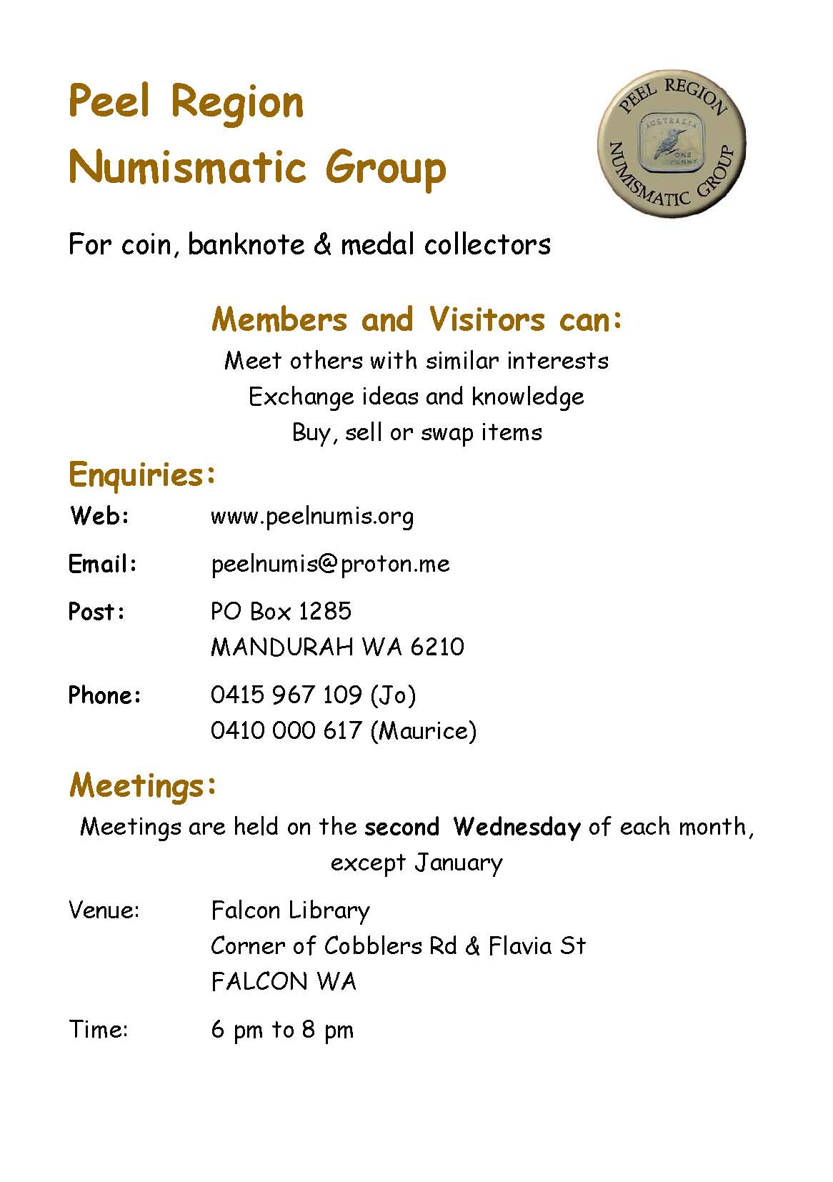 To contact Peel Region Numismatic Group, please use the contact details shown below.