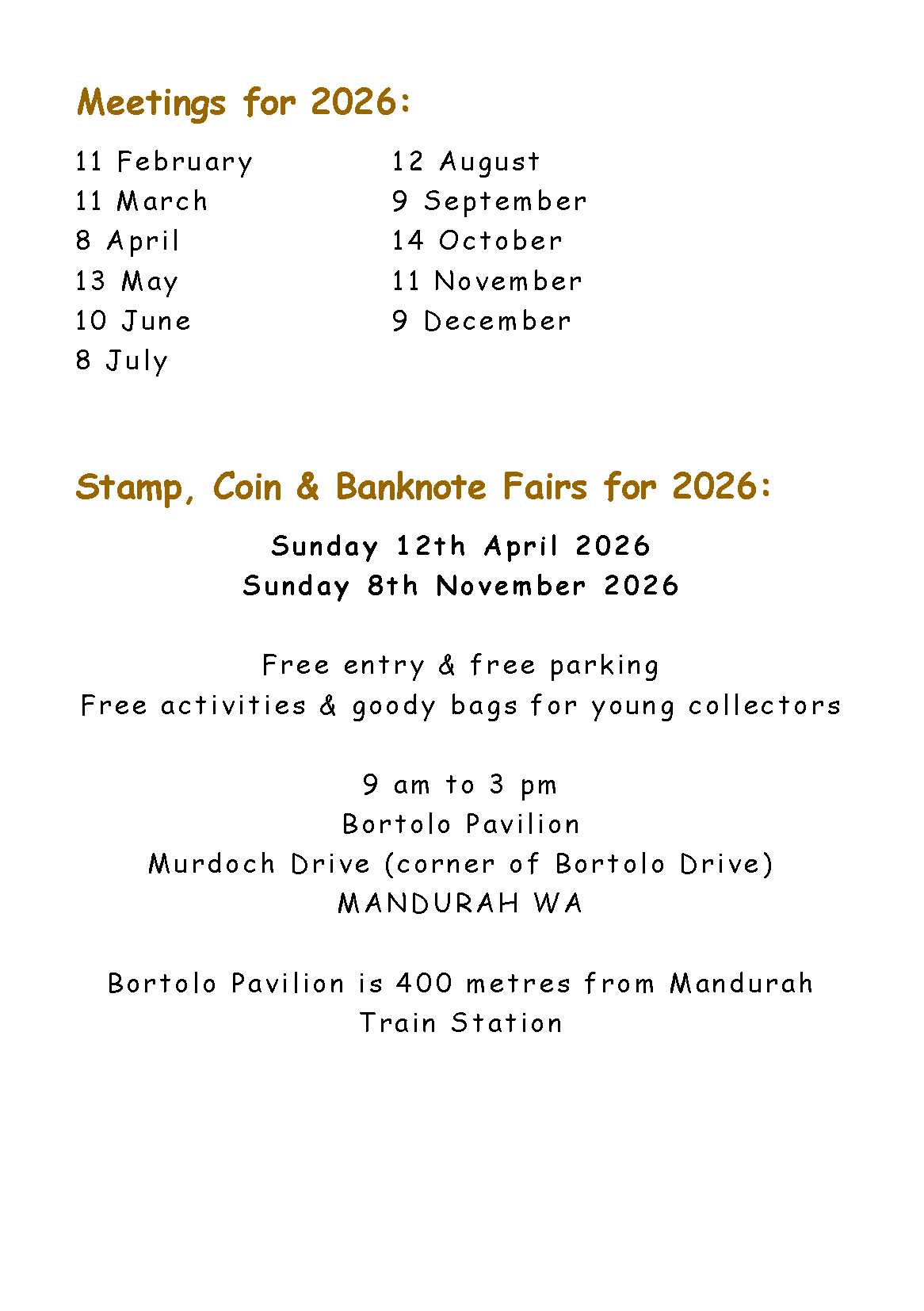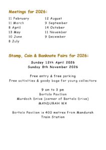 The Stamp, Coin and Banknote Fairs for 2025 will be held on: